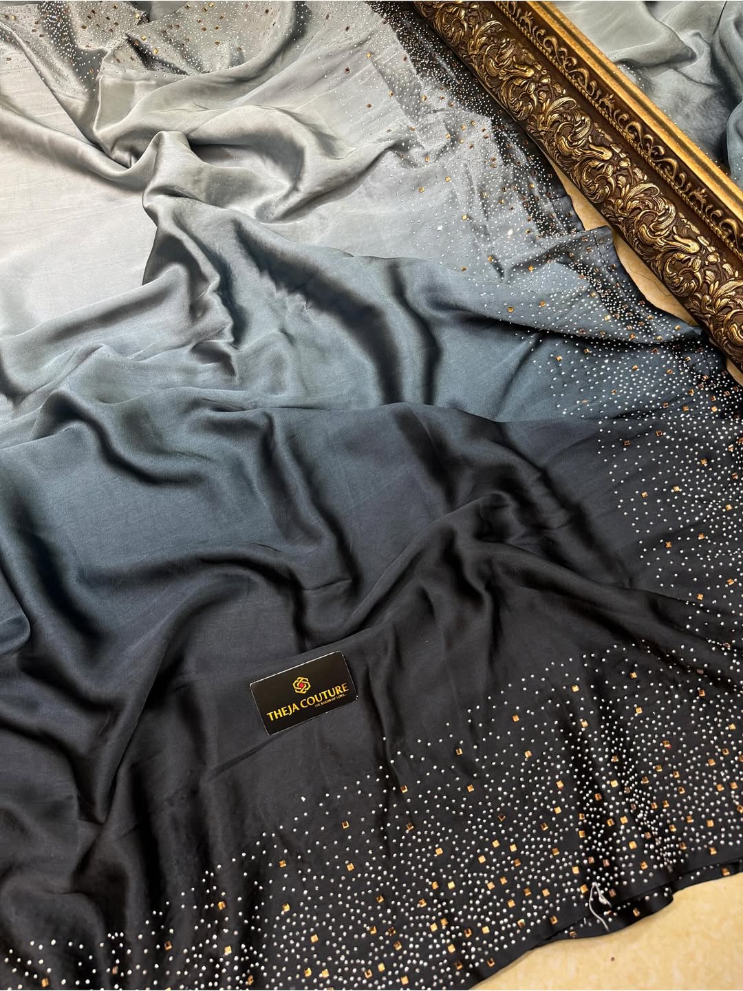 Black silver double shaded soft satin silk saree with stone work all over saree..