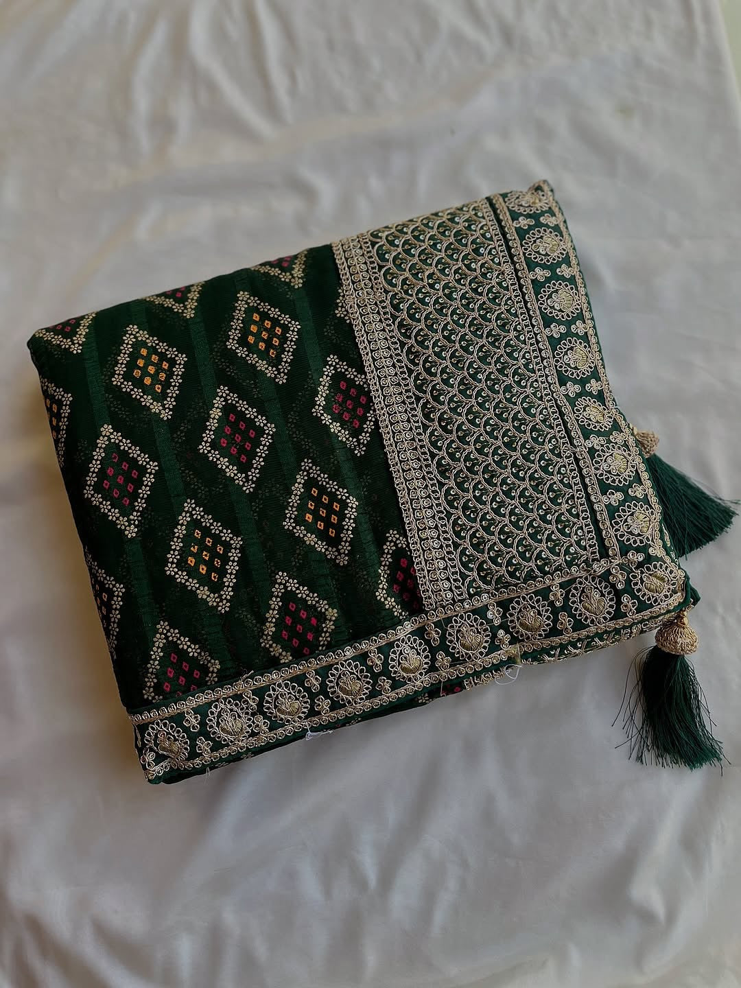 Bottle green bandani printed Georgette saree with red lace all over saree..