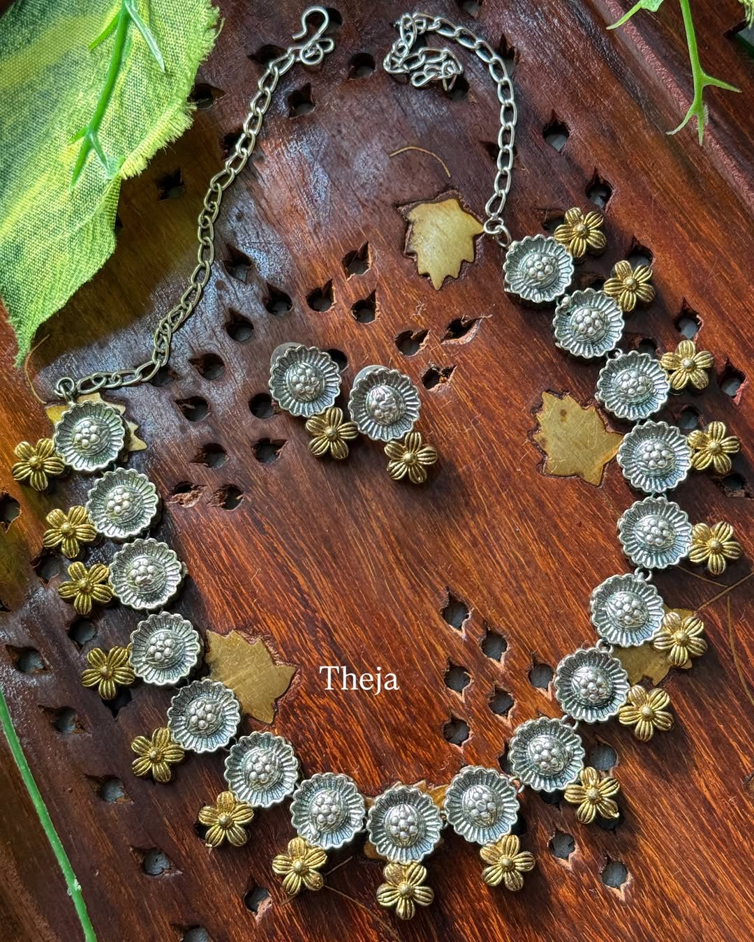 Floral oxidised silver gold short neck piece.