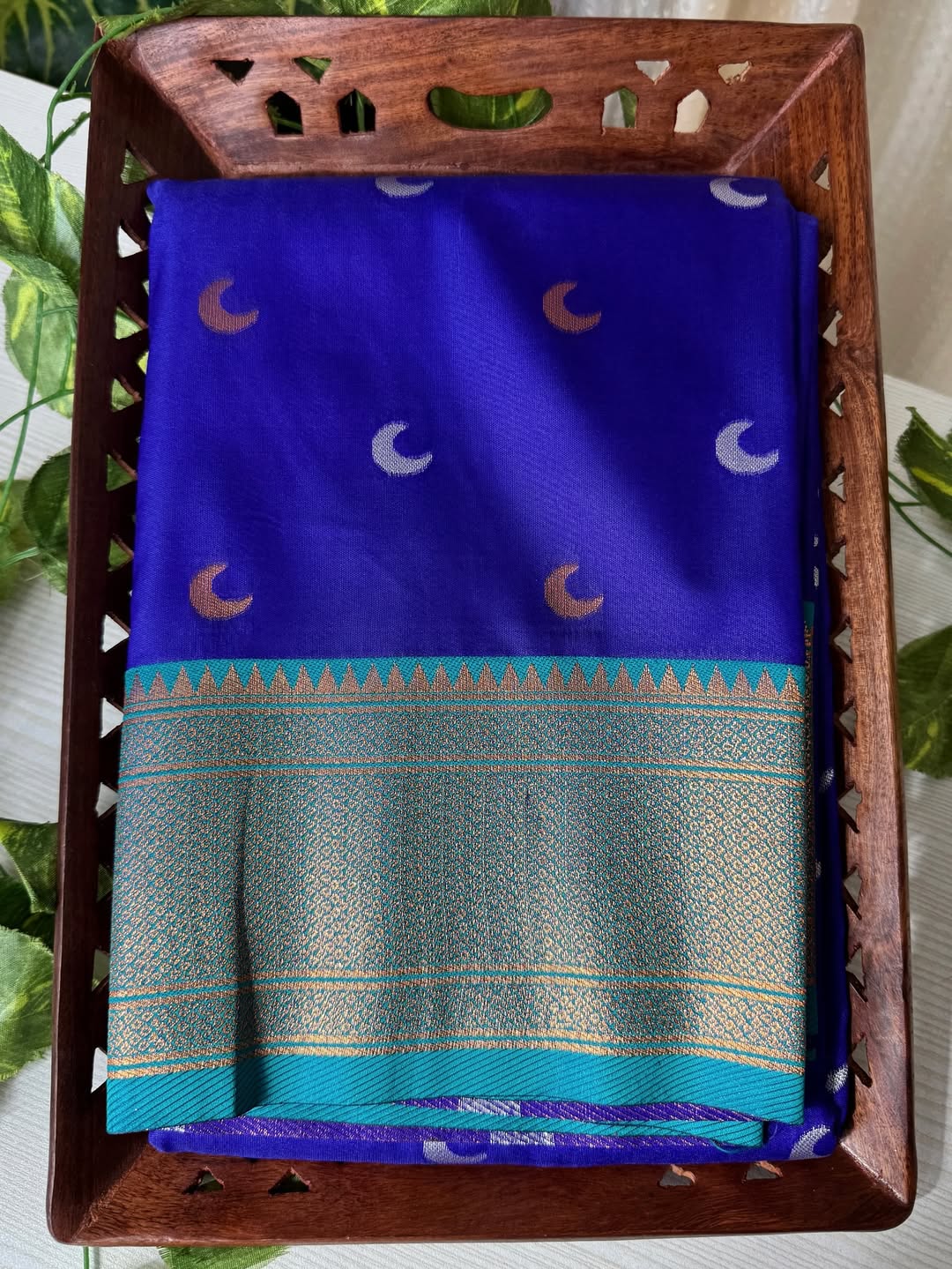 Pepsi blue chandrakor art silk with teal blue border. Comes with traditional peacock pallu.