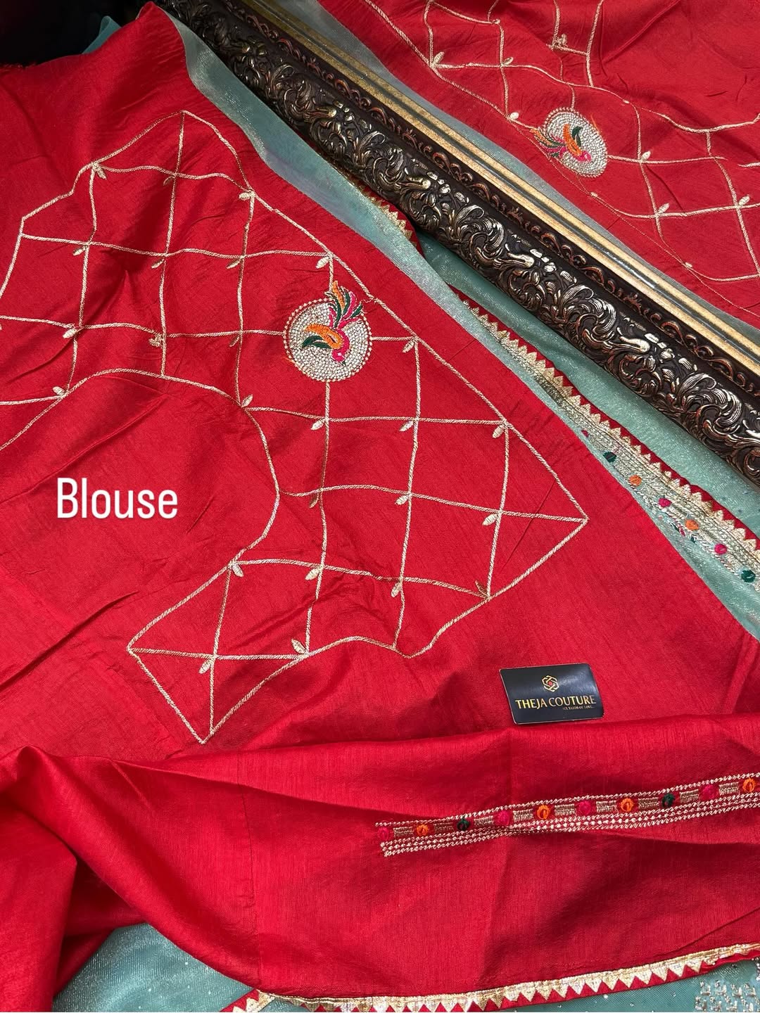 Turquoise green net saree comes with contrast embroidery border and stone work all over saree.