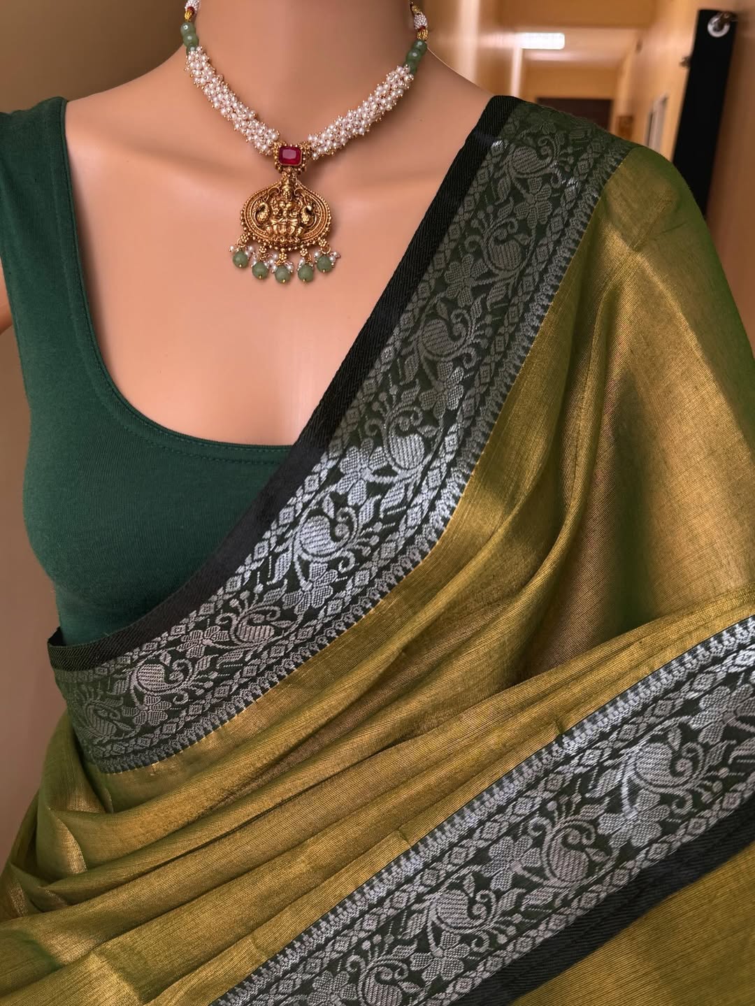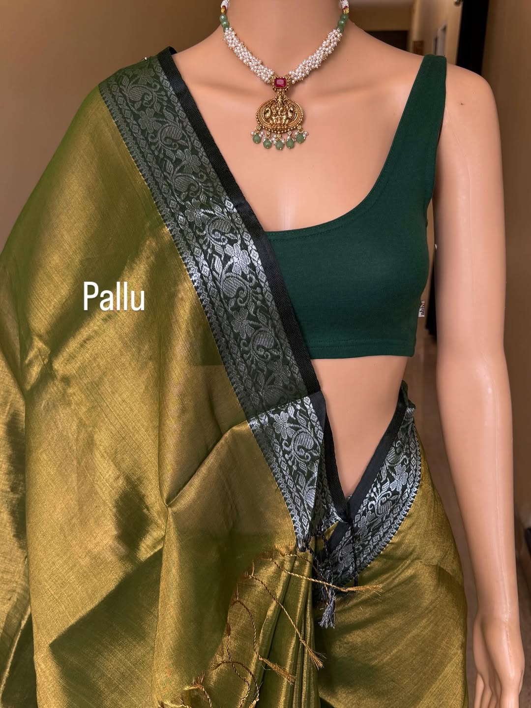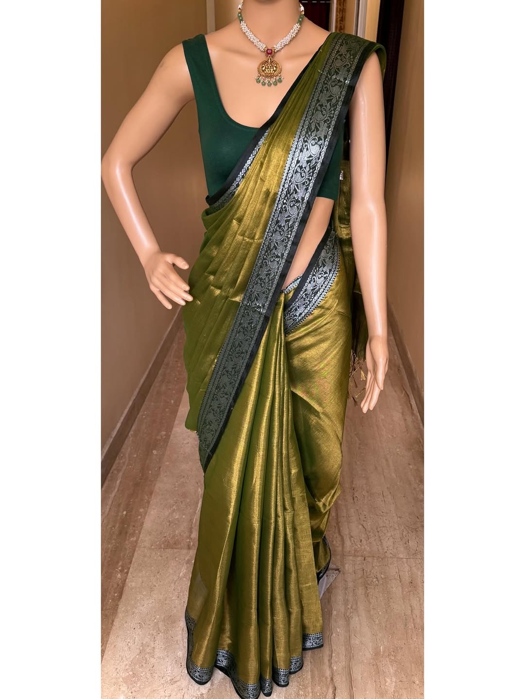 Olive green tissue saree with Olive green border. Comes with silver zari weave on border.
